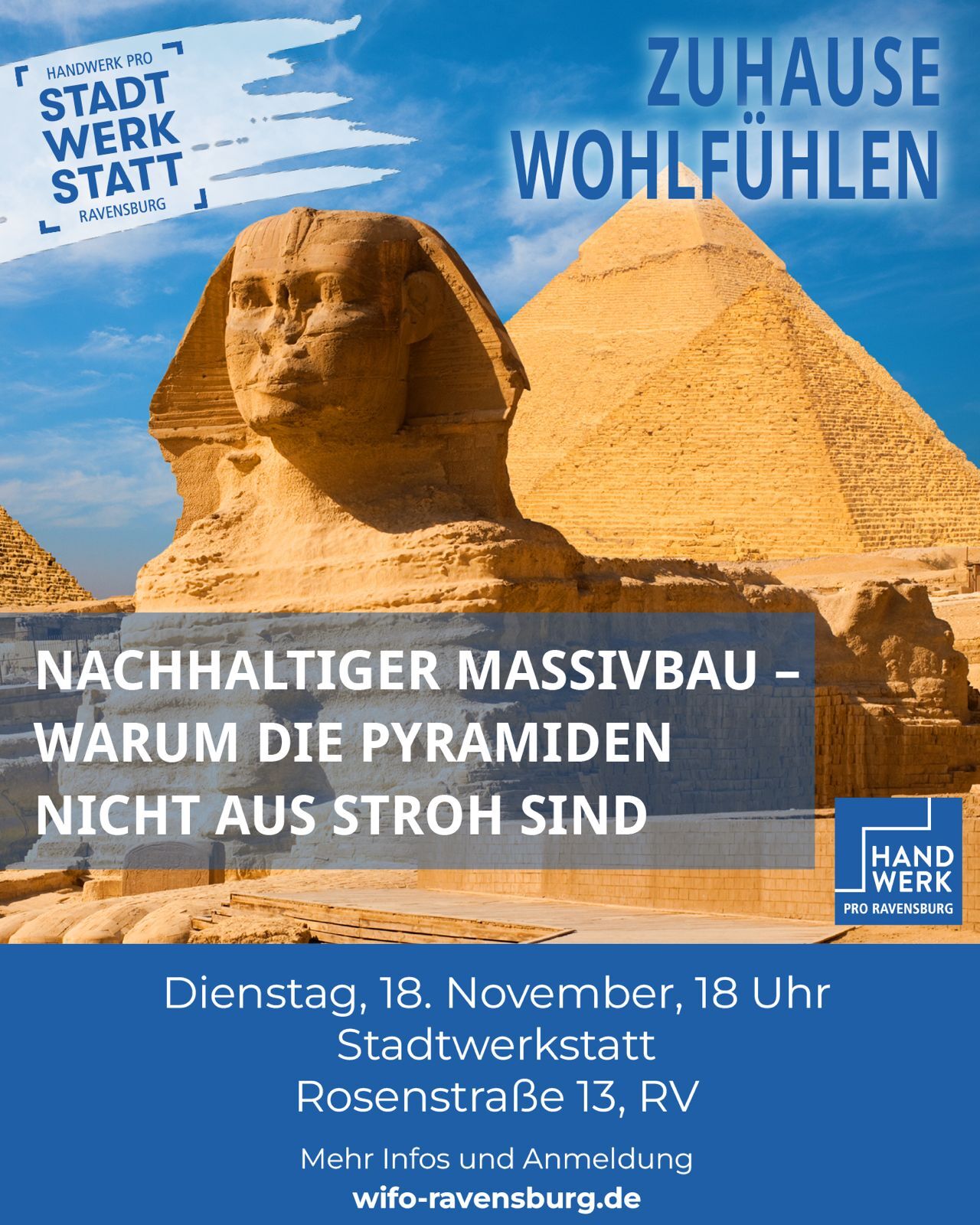 Handwerk Pro Ravensburg lädt am 18. November zu der Veranstaltung in die STADTWERKSTATT ein. Ab 18:00 Uhr sind die Türen der geöffnet, Ab 18:15 diskutieren die Experten von Handwerk Pro Ravensburg mit den Besucherinnen und Besuchern rund um das Thema Massivbau. Im Anschluss haben Interessierte die Möglichkeit, sich in entspannter Atmosphäre individuell mit den Experten über ihr eigenes Projekt auszutauschen. Der Eintritt ist frei, für Getränke ist gesorgt.