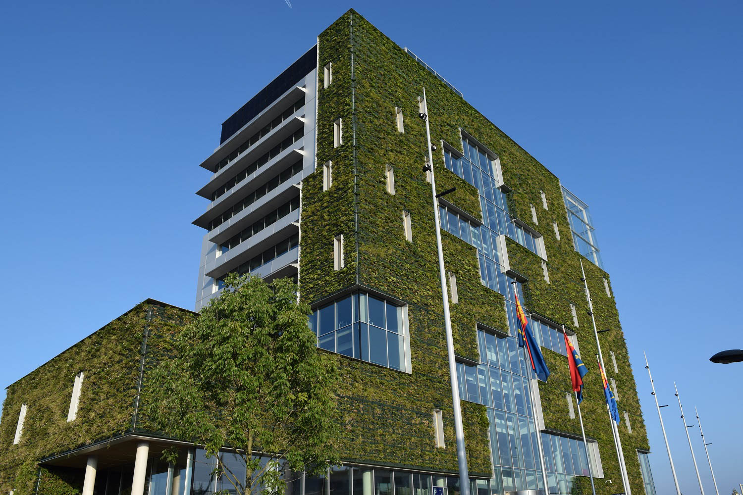 Ebenso wichtig ist die regelmäßige Pflege. Abgestorbene Pflanzenteile und trockenes Holz müssen entfernt werden, damit die Begrünung nicht zum Risiko wird. Ist all dies berücksichtigt, entsteht eine Fassade, die nicht nur ein optisches Highlight ist, sondern auch wie eine Null-Energie-Klimaanlage arbeitet: Sie schützt, kühlt und trägt zur Verbesserung des Mikroklimas bei.