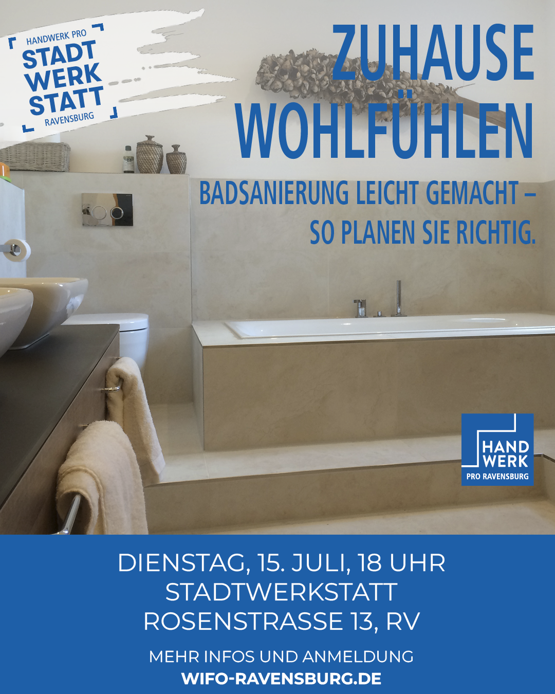 Im Vortrag am Dienstag, 15. Juli 2025 in der STADTWERKSTATT Ravensburg erfahren die Besucher, worauf sie achten sollten, damit das Projekt „Badsanierung“ reibungslos abläuft. Das Ziel: Eine Komplettlösung aus einem Guss, mit den passenden Fachhandwerkern für jede Aufgabe.