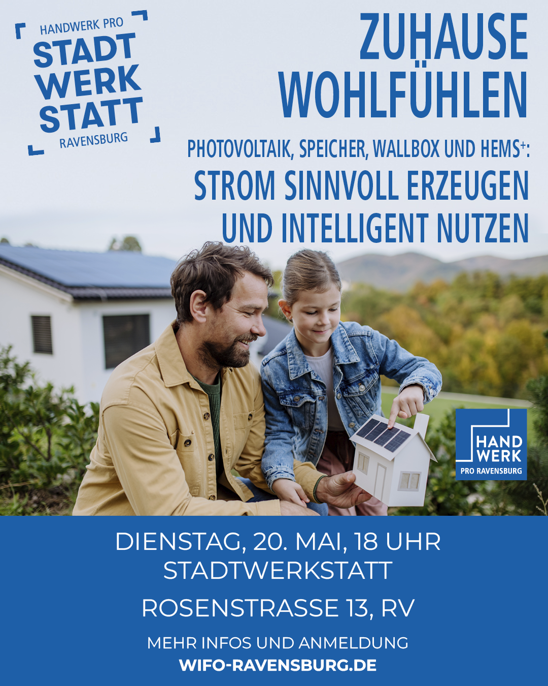 Am 20. Mai 2025 lädt die Stadtwerkstatt Ravensburg im Rahmen der Veranstaltungsreihe „Zuhause Wohlfühlen“ zu einem informativen Abend rund um die Themen Photovoltaik, Speicher, Ladestation und Energiemanagement ein.